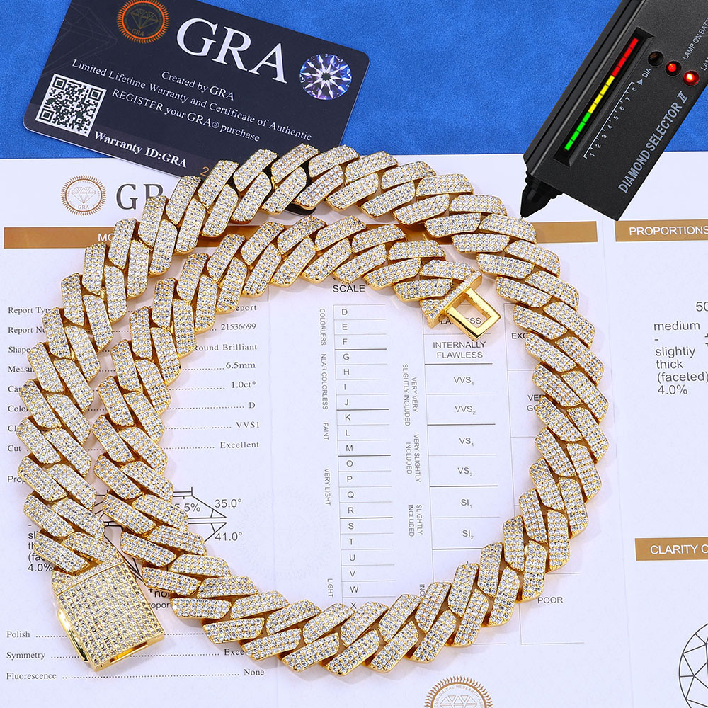 Shop our 20mm Sharp-Edge Moissanite Sterling Silver Prong Cuban Link Chain Necklace & Bracelet in bulk. 18K Gold or Rhodium plated necklace and bracelet featuring micro-pave VVS stones for a massive hip-hop statement. for a massive hip-hop statement.