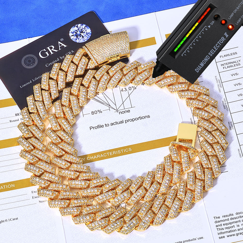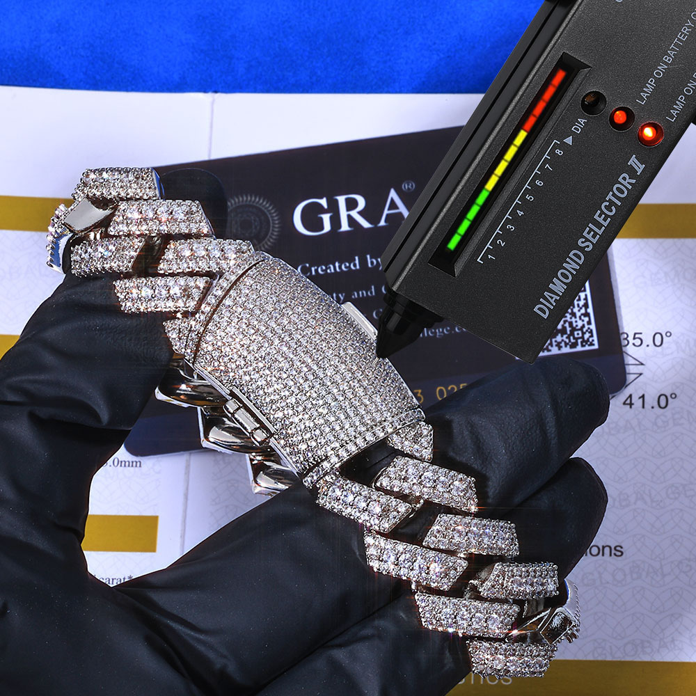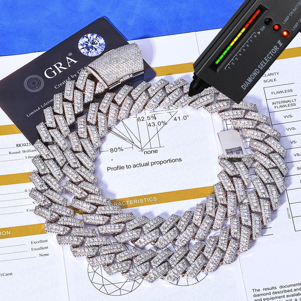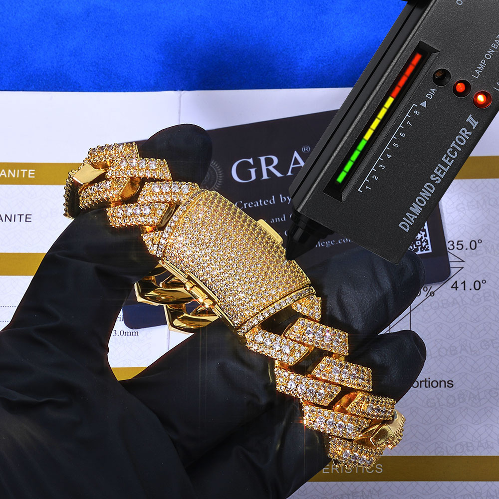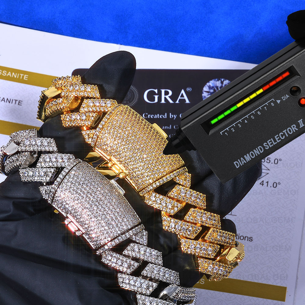 Shop our 20mm Tiered Round Moissanite Sterling Silver Cuban Link Chain Necklace & Bracelet in bulk. 18K Gold or Rhodium plated necklace and bracelet featuring dual-size VVS stones for a massive hip-hop statement.