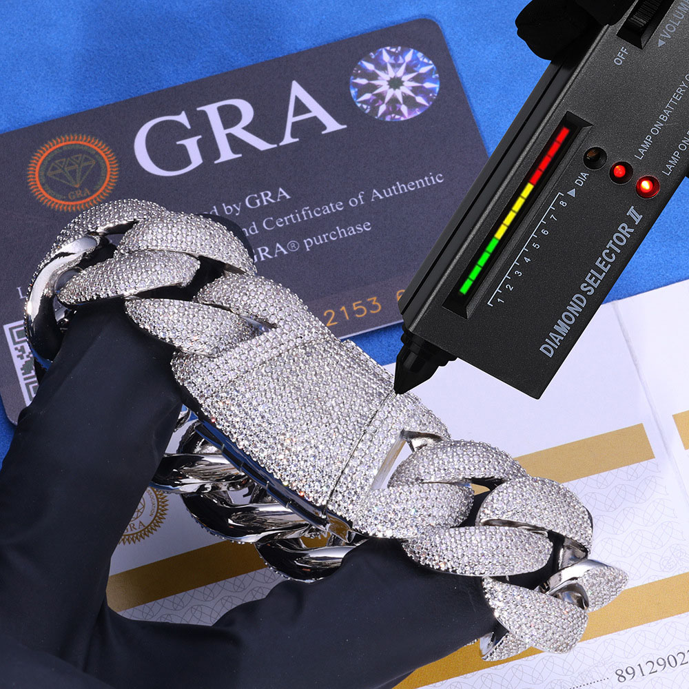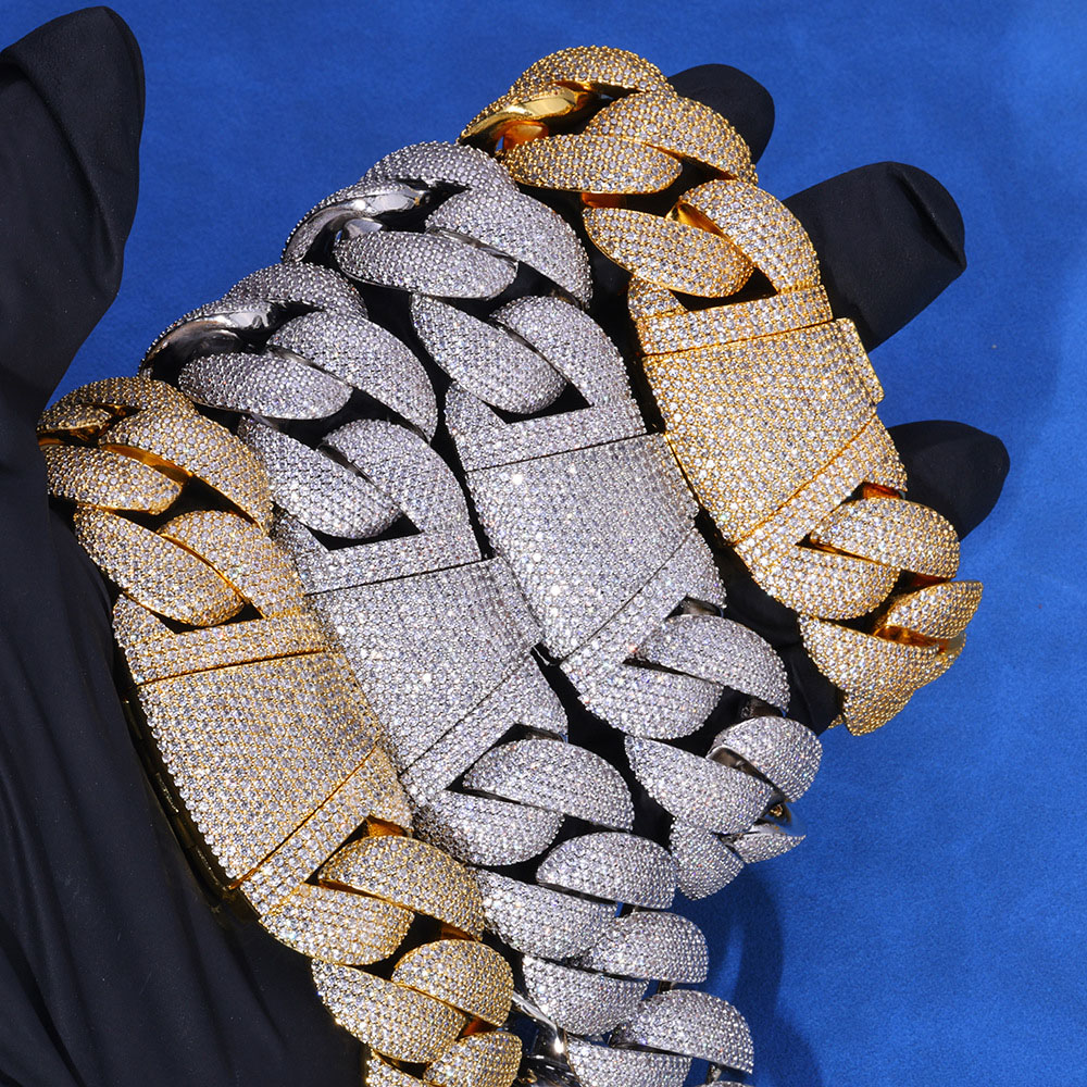 Wholesale 24mm Micro Pave Moissanite Cuban Link Chain Necklace & Bracelet. Heavy .925 Sterling Silver, VVS Diamond-Grade fire. 18K Gold & Rhodium plated. Diamond tester positive. Premium bulk supply for hip-hop jewelry brands.