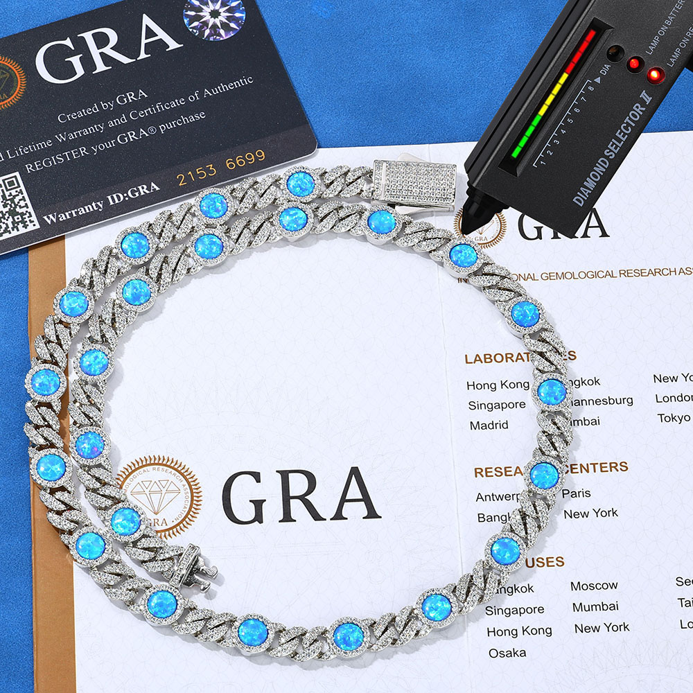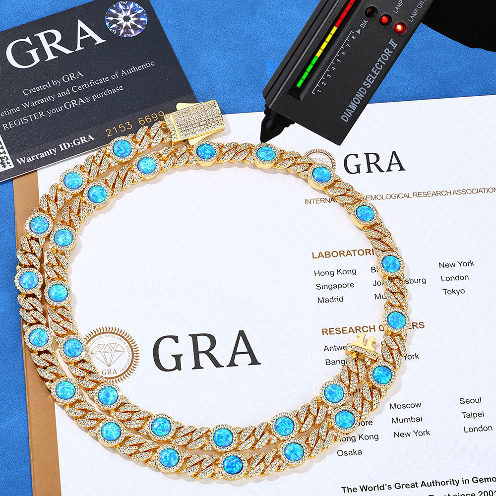 Premium 8mm Moissanite Cuban link Necklace & Bracelet featuring vibrant blue gemstones. Solid .925 Sterling Silver in 18k Gold or Rhodium. Bulk pricing for iced-out jewelry retailers.