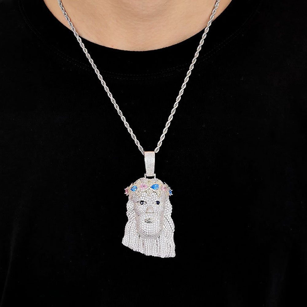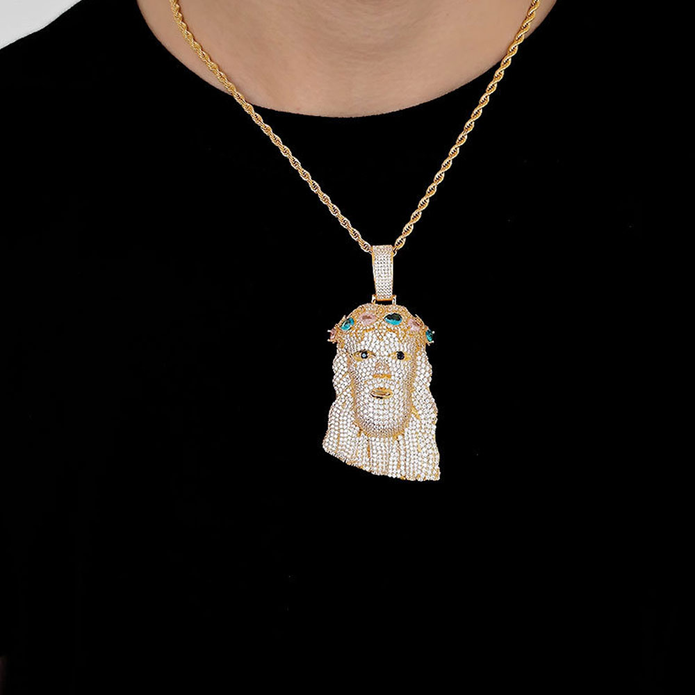 Elevate your jewelry collection with this exquisite Jesus Head pendant. Crafted from high-quality copper and flooded with brilliant cubic zirconia, the design showcases a unique multi-colored crown. Its detailed craftsmanship and icy finish make it an ideal centerpiece for any chain.
