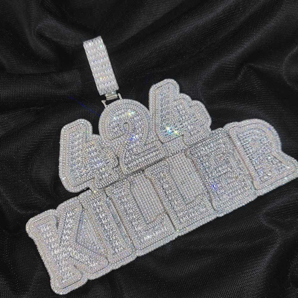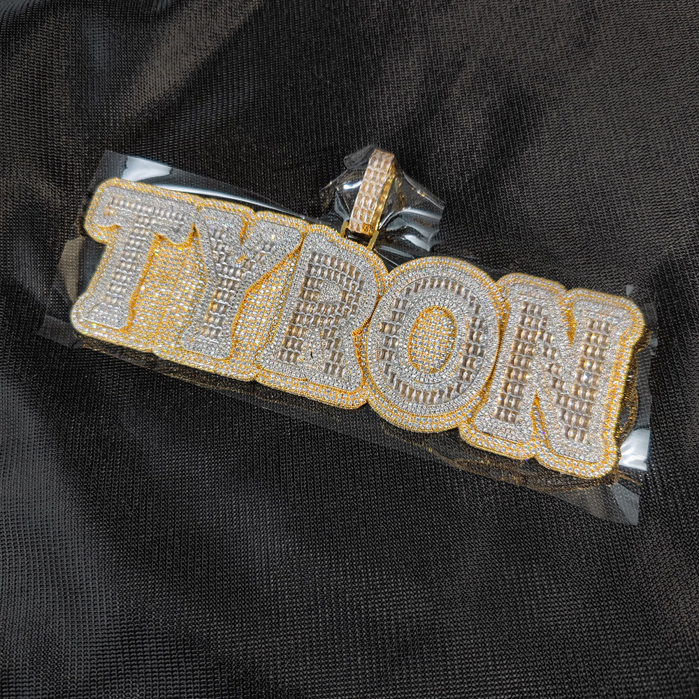 Make a bold, personalized statement with our Custom Baguette Gothic Font Name Pendant. Featuring edgy, Old English style lettering, this piece is fully iced out with AAA+ cubic zirconia on a durable copper base for a high-end, heavy-duty hip-hop aesthetic.
