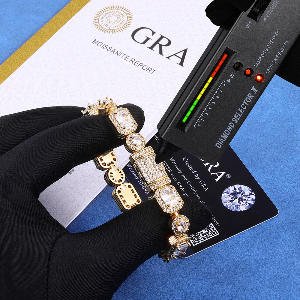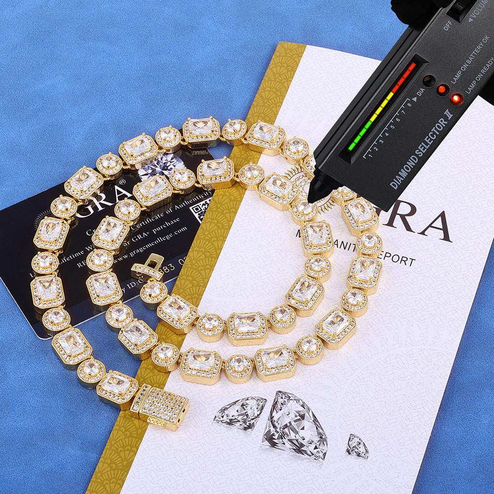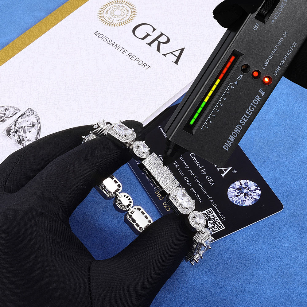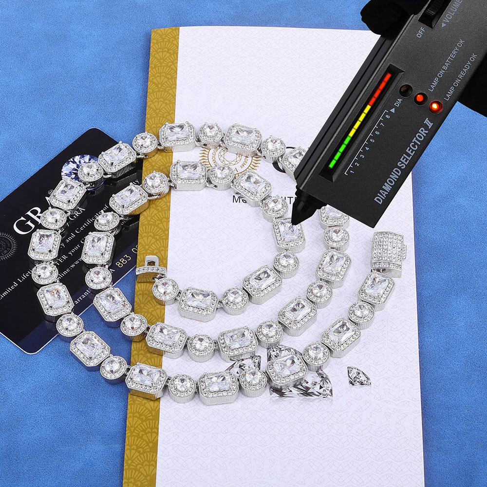 Shop our 10mm Iced Out Moissanite Round and Rectangular Cluster Chain Necklace & Bracelet. Features two distinct stone shapes in 925 Sterling Silver. VVS1 Clarity, 18K Gold or Rhodium plating.