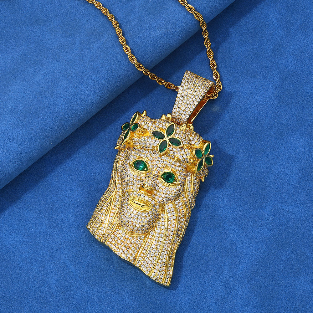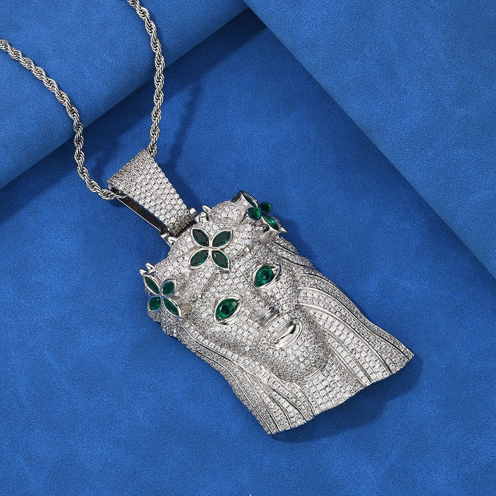 This unique Green Eye & Flower Crown Jesus Head Pendant is a vibrant take on a hip-hop classic, blending traditional iconography with bold color. Crafted with a durable copper base, the pendant features a 3D-sculpted face of Jesus adorned with a distinctive crown of four-petaled flowers.