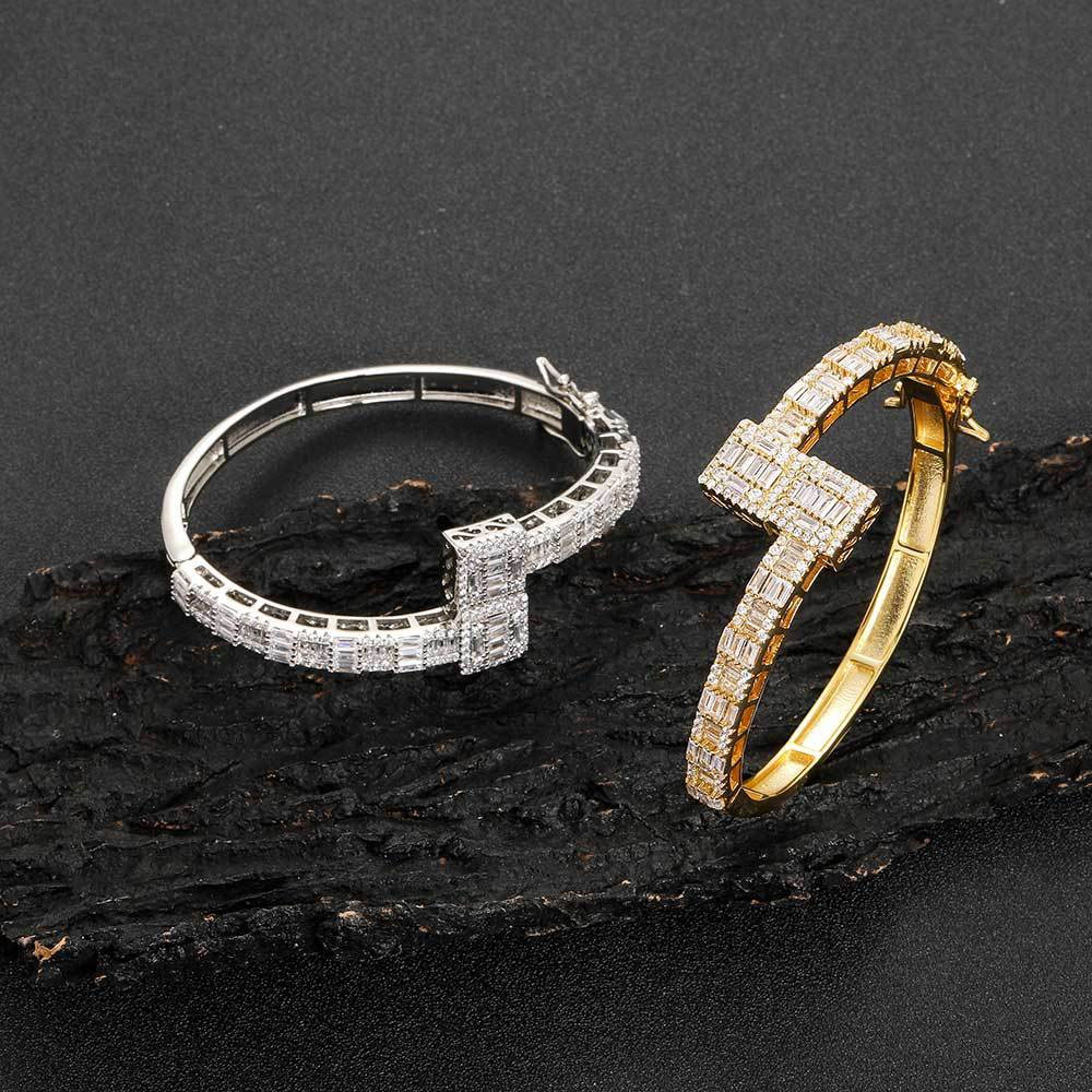 This iced-out baguette bangle defines modern luxury. Combining traditional micro-pave accents with striking baguette-cut stones, it offers a sophisticated architectural shine. Built with a sturdy copper core and high-polish finish, it is the ultimate hip-hop statement piece.