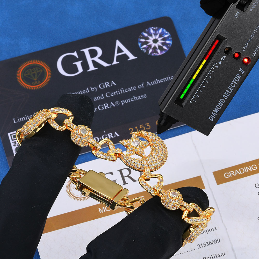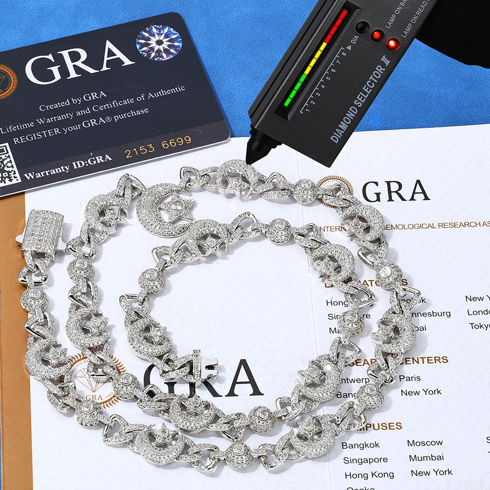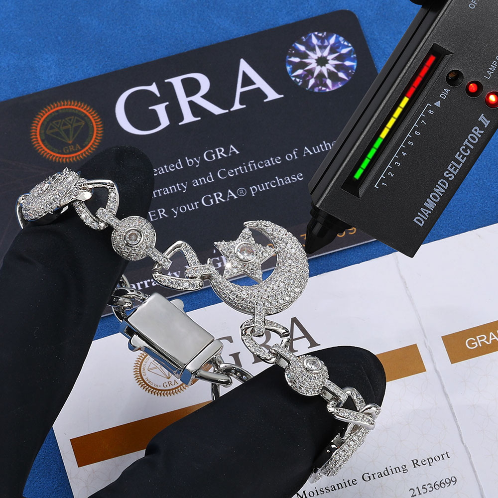 Source our 10mm Iced Moon & Star Moissanite Tennis Link Chain Necklace & Bracelet in bulk. VVS clarity, 925 Sterling Silver in 18K Gold or Rhodium. Pass the diamond tester in style.