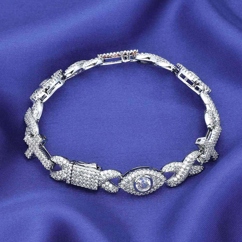 This complex link design combines spiritual symbolism with a high-impact urban aesthetic. The mix of infinity loops, crosses, and evil eye motifs creates a rich, textured appearance that captures light from every angle.