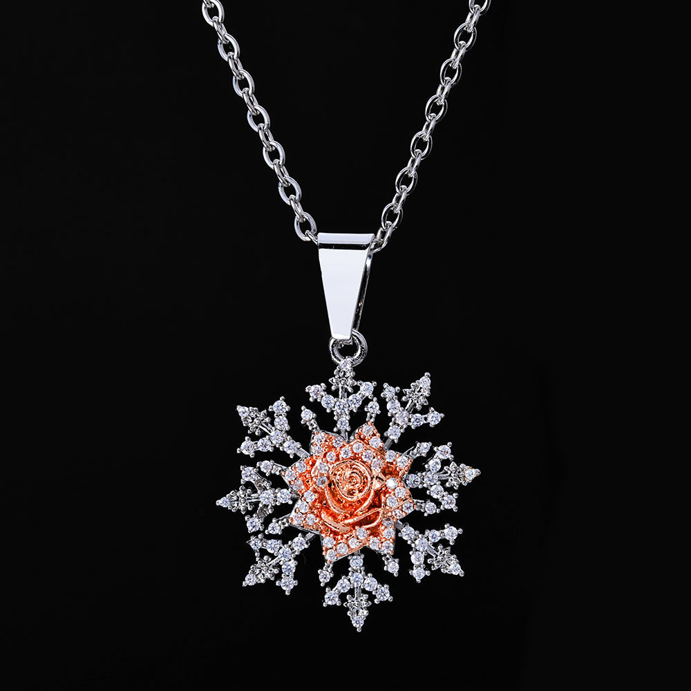 Iced Out Snowflake and Rose Pendant – Hip Hop Winter Rose Snowflake Necklace