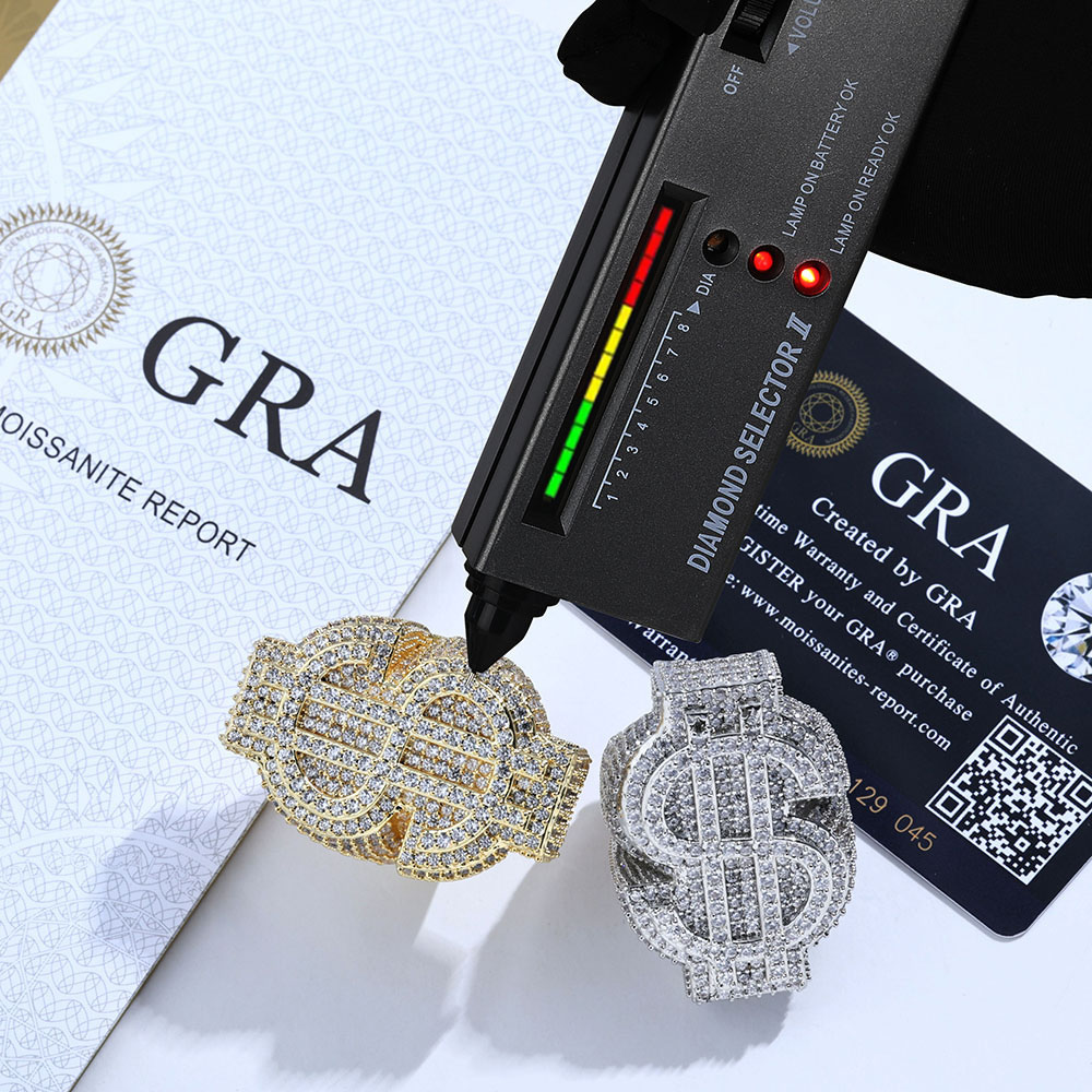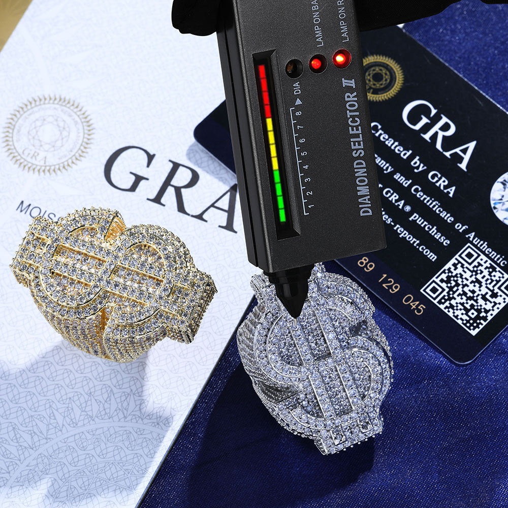 Our Chunky Iced Out VVS Moissanite Dollar Sign Ring is in Solid 925 Silver base, GRA Certified, and passes diamond testers. Large 3D iced-out money motif in Gold & Silver.