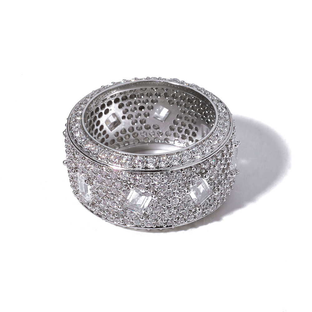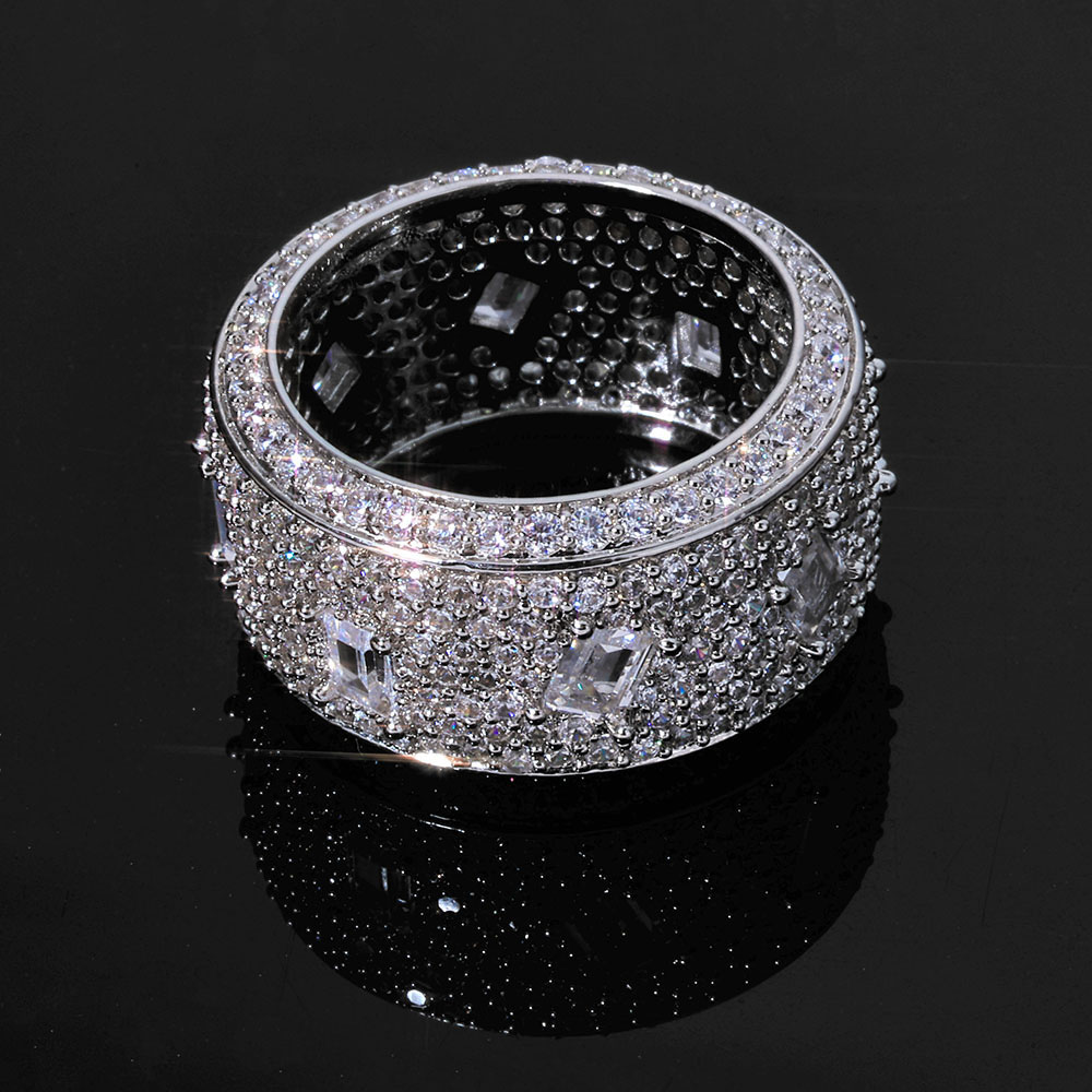 • Command attention with our Large Luxury Iced Out CZ Band Ring. Featuring a heavy-duty copper base, hundreds of round micro-pave stones, and center-set baguette cut Cubic Zirconia, this flooded statement band is the ultimate urban luxury piece.