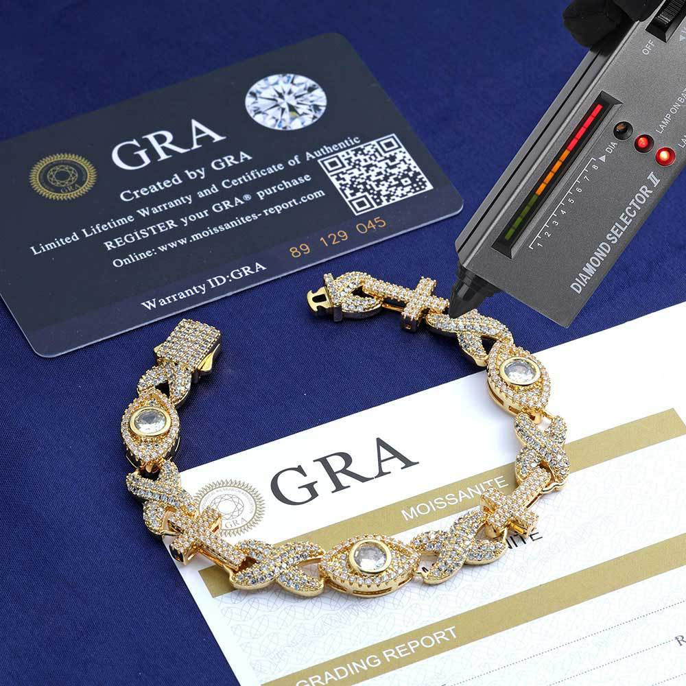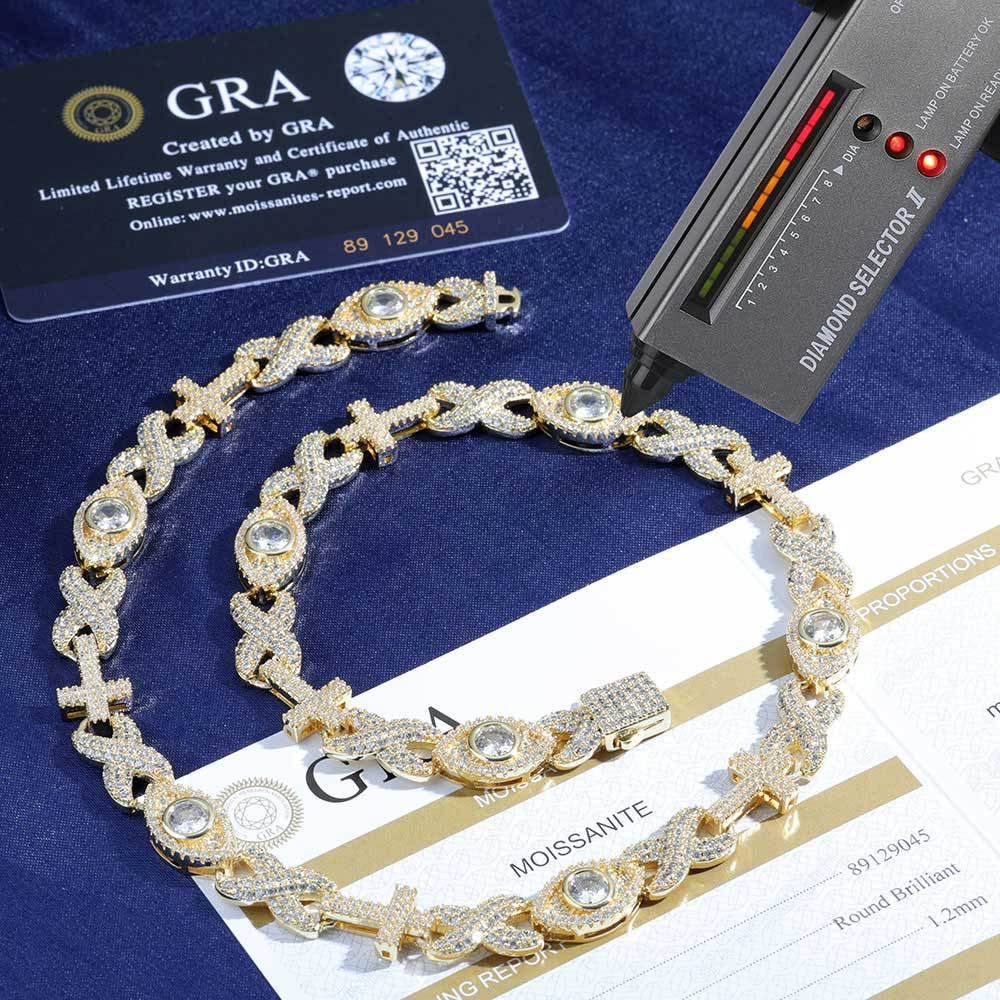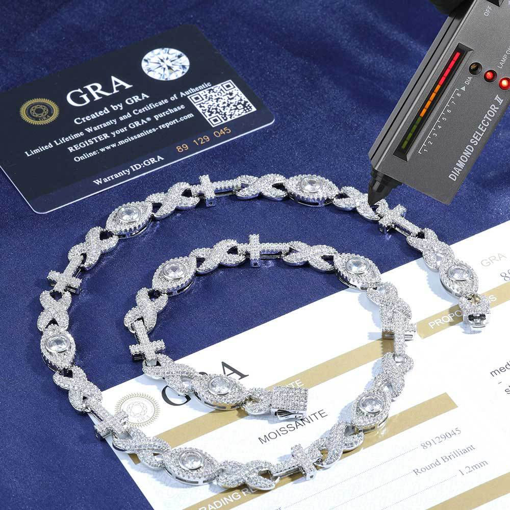 Shop our 10mm Multi-Motif Moissanite Sterling Silver Link Necklace & Bracelet. Featuring Cross, Infinity, and Evil Eye links in VVS Moissanite. 18K Gold & Rhodium plated necklace and bracelet for an elite spiritual statement.