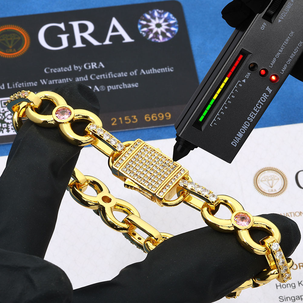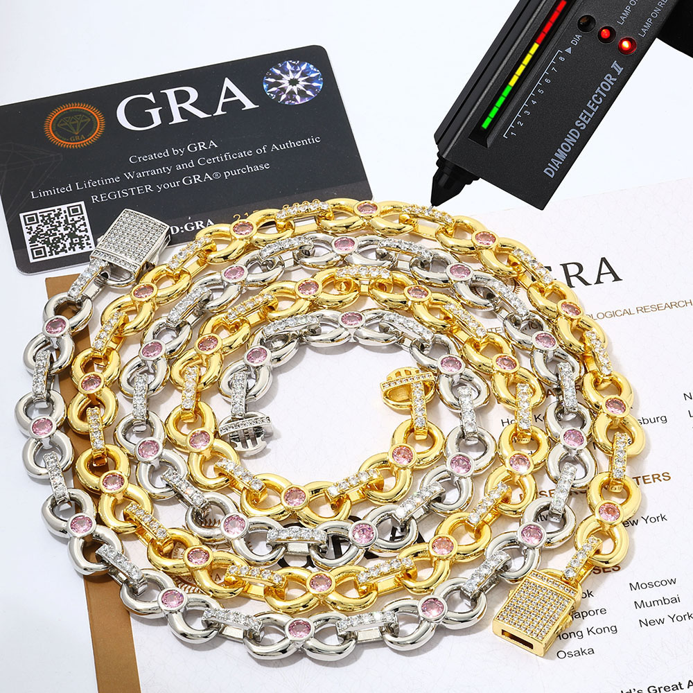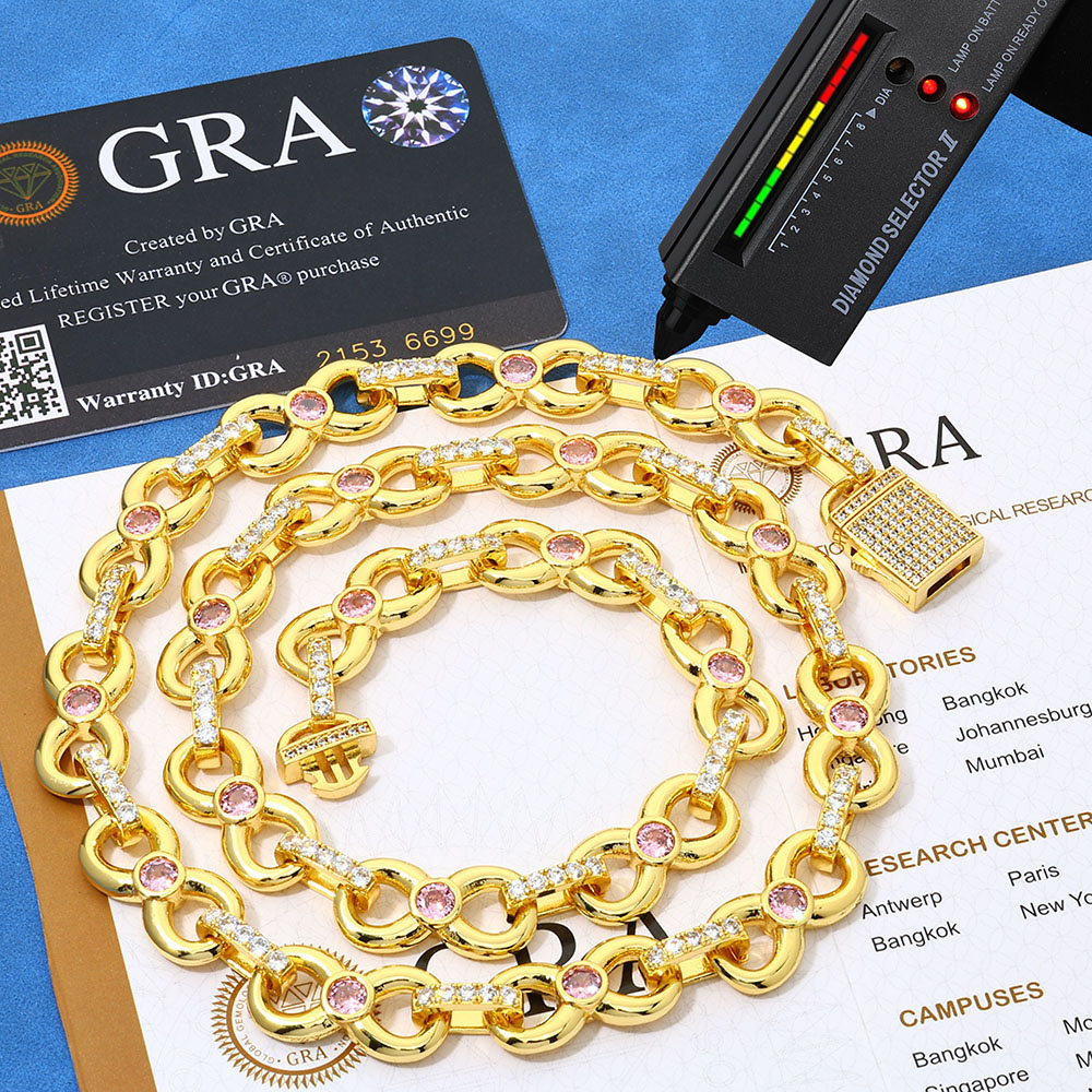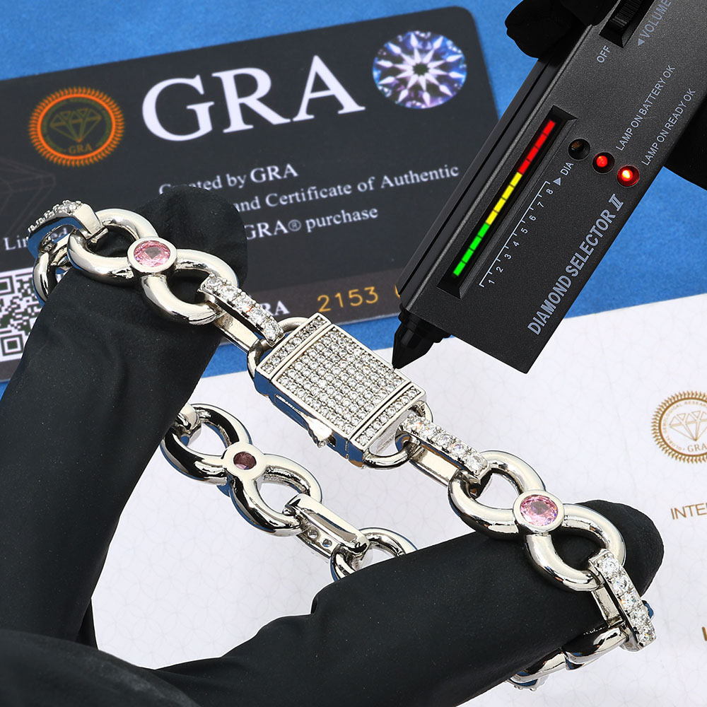 Shop the 12mm 925 Sterling Silver Infinity Link Chain Necklace & Bracelet in bulk. Featuring a pink center stone and VVS1 Moissanite circle links in 925 Silver. Available in 18K Gold or Rhodium.