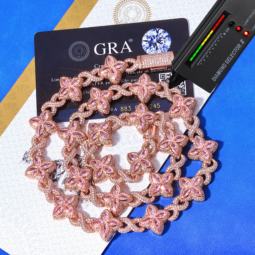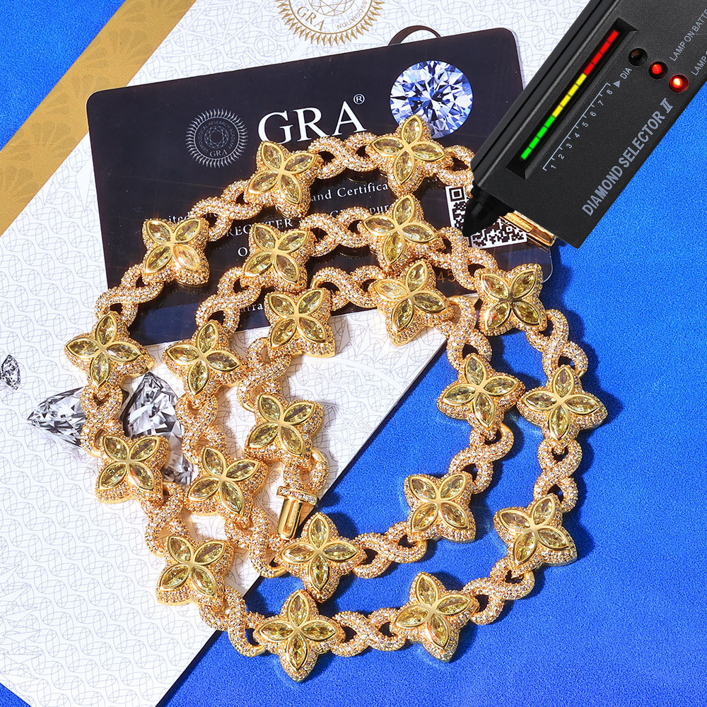 Shop our 17.5mm Infinity Clover Moissanite Sterling Silver Link Necklace & Bracelet. Available in 18K Gold, Rose Gold, and Rhodium plating with White, Pink, Blue, or Yellow gemstones. VVS Moissanite Hip-Hop Statement Jewelry.