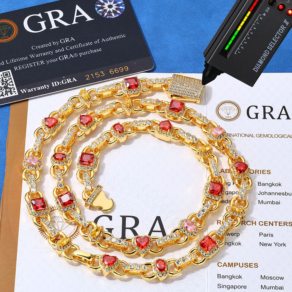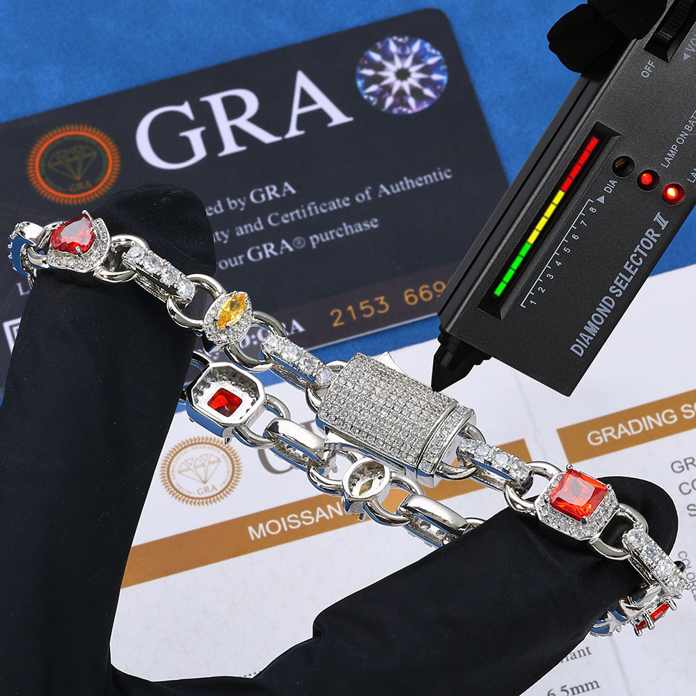 Upgrade to elite luxury with our Multi-Cut Fancy Link Chain. Featuring VVS Heart, Square, and Marquise Moissanite in a 925 Silver halo setting. A masterpiece of color and shine that passes the diamond tester.