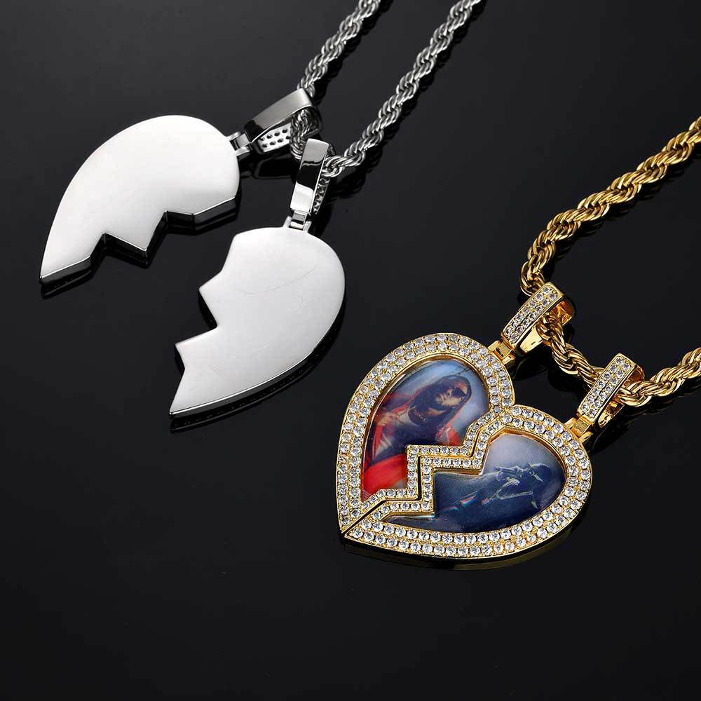 Personalized Iced Out Two-Part Heart Photo Pendant – Custom CZ Memory Necklace