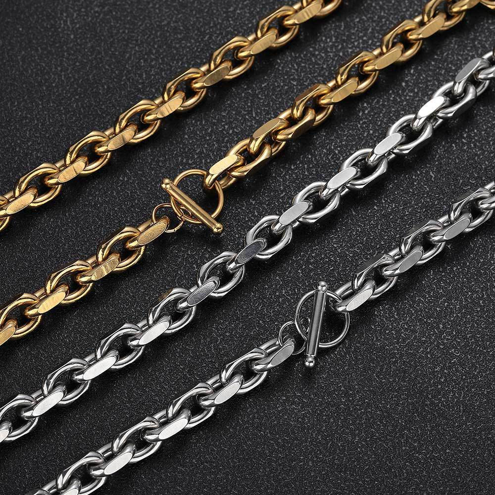 Elevate your jewelry collection with the Stainless Steel Flat Edge Cable Chain Necklace & Bracelet. Features 9mm flattened links, a bold toggle clasp, and tarnish-free gold or silver finishes.
